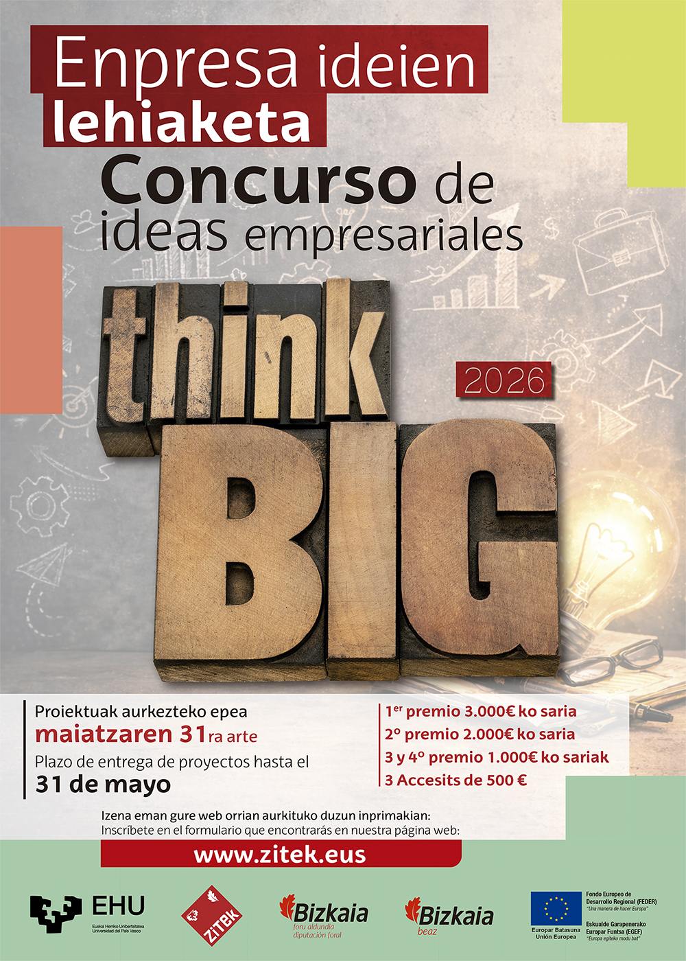 Este concurso de ideas empresariales tiene como objetivo fomentar el espíritu emprendedor entre las/os universitarios/as del Campus de Bizkaia, animándoles a que apliquen sus conocimientos y experiencias profesionales, con el fin de que desarrollen servicios y productos viables comercialmente.